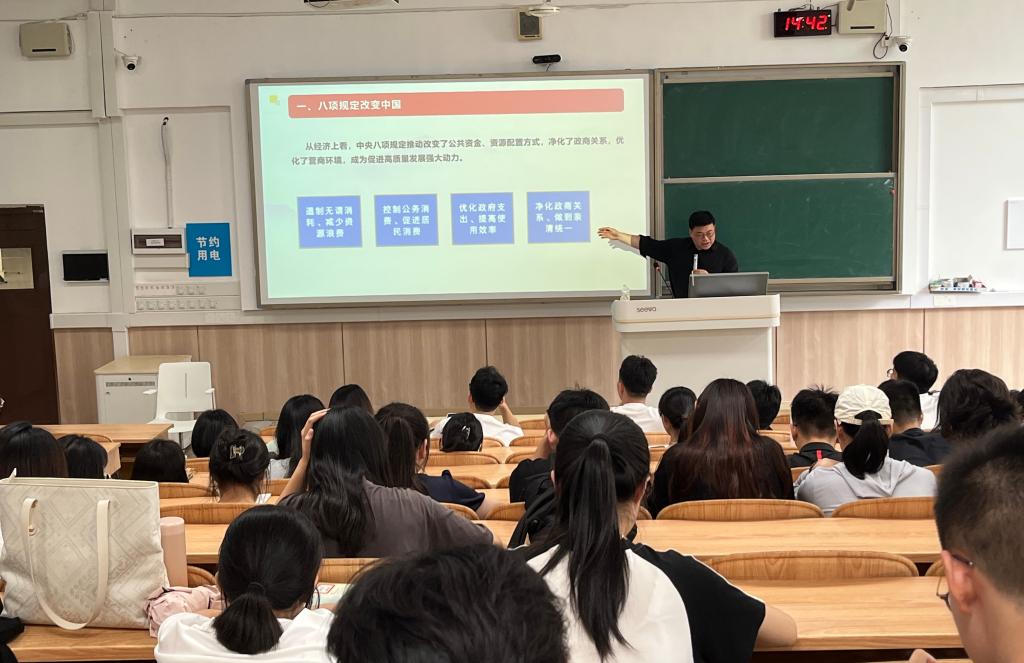 會上,馬彬彬首先強調(diào)了學(xué)習(xí)貫徹中央八項規(guī)定精神的重要意義,帶領(lǐng)全體與會黨員系統(tǒng)回顧了黨的十八大以來,以習(xí)近平同志為核心的黨中央在推動全黨作風(fēng)建設(shè)上所積累的寶貴經(jīng)驗。其次重點解讀了《黨政機關(guān)厲行節(jié)約反對浪費條例》的核心要義與實踐要求。馬彬彬結(jié)合當前形勢,詳細闡述了推進節(jié)約型機關(guān)建設(shè)的必要性和具體路徑,要求全體黨員干部要帶頭厲行勤儉節(jié)約、反對鋪張浪費,將過“緊日子”要求內(nèi)化于心、外化于行。最后黨課堅持“以案為鑒”,選取了多個違反中央八項規(guī)定的典型案例進行深刻剖析。通過還原案例細節(jié)、剖析問題根源與學(xué)生黨員進行交流,馬彬彬警示全體黨員干部必須時刻保持清醒頭腦,從反面教材中汲取深刻教訓(xùn),切實筑牢拒腐防變的思想防線。