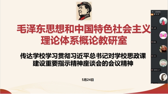 5月24日14:00,我院毛澤東思想和中國特色社會主義理論體系概論(毛概)教研室通過線上騰訊會議的形式組織召開了學習傳達學校學習貫徹習近平總書記對思政課建設指示精神座談會重要內容集體備課會。教研室全體專兼職教師參加了集體備課會,共同學習如何將習近平總書記的最新指示精神融入毛概課程的教學實踐中。